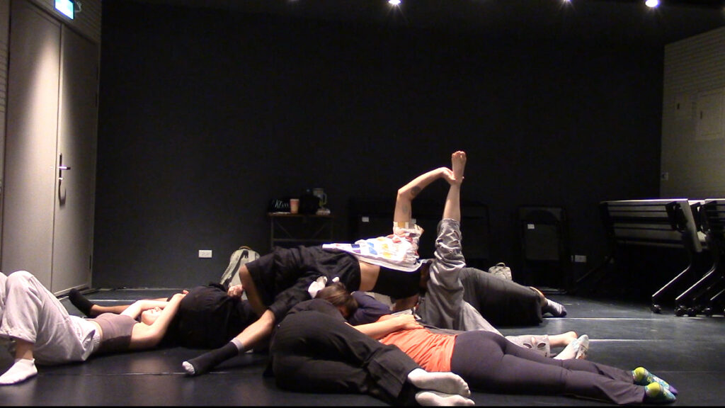 テレマティックパフォーマンスの実践に入る前に、まず各大学の先生方によるさまざまなワークショップを受けました。特に台北チームは、ダンサーであるChengchieh Yu先生のレクチャーを毎日受けました。たとえば、動きや演技、ストーリーを交えながら自分の名前を紹介するリレーや、ペアを組んで体のさまざまな部位を使って触れ合い、身体を通じた挨拶やコミュニケーションを試みる活動です。また、お互いの動きをミラーリングして新しい表現に挑戦する取り組みも行いました。