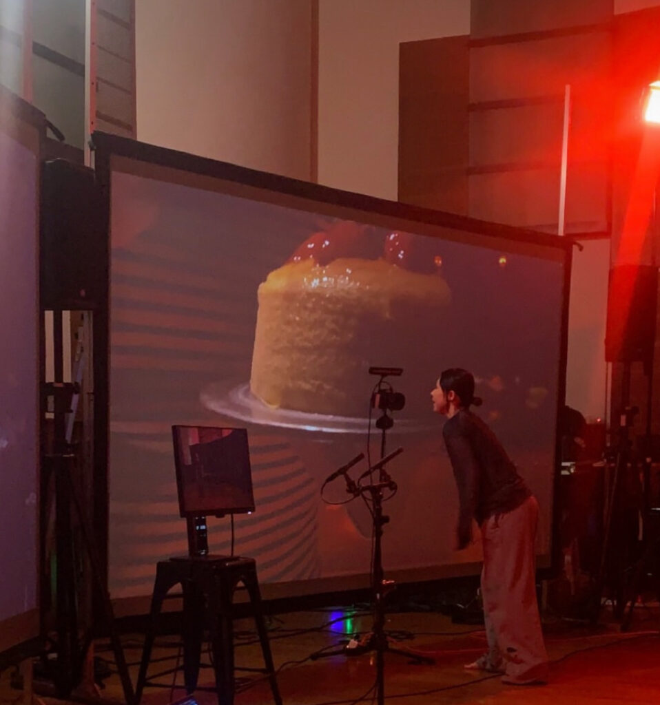 最後に挑戦したテーマは「感覚体験」でした。ここでは、これまでの課題を意識しながら、「離れているのに一緒にいる」という感覚を強めることを目指しました。本来テレマティック空間では共有できない嗅覚・味覚・触覚を「想像力」を通して共有しようと試みました。各拠点の参加者がそれぞれ食べ物を持ち寄り、「匂いがする」と言い合ったり、食べさせ合うように振る舞ったりしながら、美味しさや不味さを共有しました。さらに食後には、画面を通して相手に触れるように手を伸ばしたり、上着を着せてあげるように演じたりと、あたかも同じ空間にいるかのように遊ぶことで、テレマティック空間を最大限に活かそうとしました。