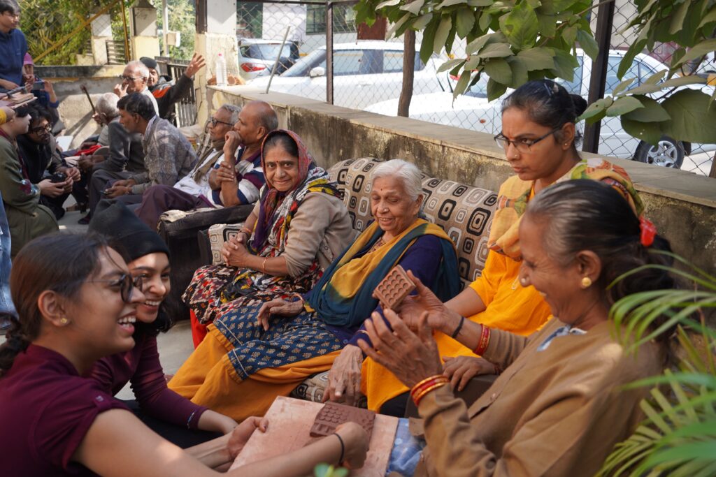 訪問先はアーメダバード市内の三つの高齢者施設で、短期滞在型から長期居住型まで、運営形態や背景がそれぞれ異なっていました。特に、インド赤十字社が運営するVatsalya Senior Citizens Homeでは、独立して生活する高齢者の方々が活発に創造的活動に参加し、学生たちとの交流の中で共創的な関係が生まれました。また、Shree Maniben Tribhuvan Matragruhでは、高齢者から道具の改良に関する具体的な助言を受け、学生たちは実践を通じて「道具づくり」の本質を学びました。こうした出会いは、単なる制作体験を超えた、互いの理解と学びの場となりました。