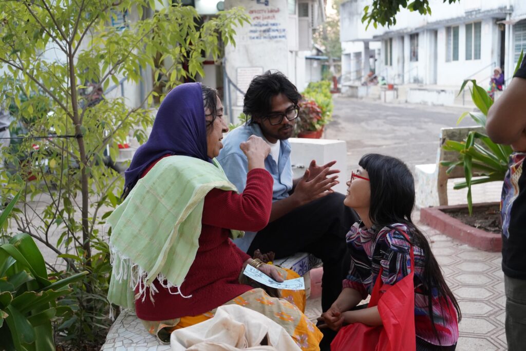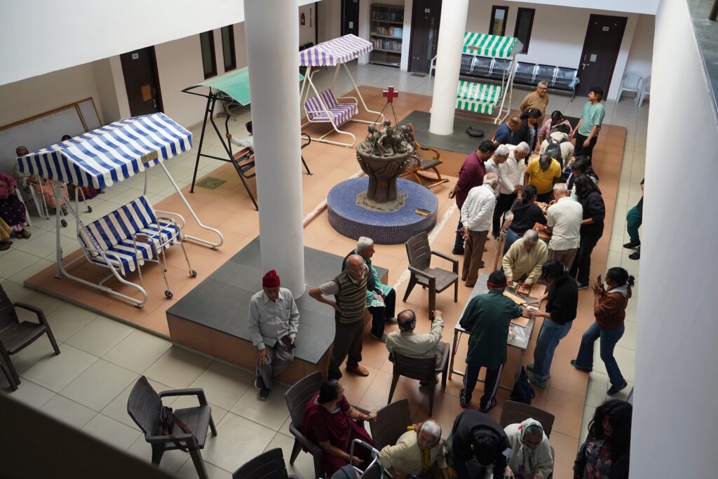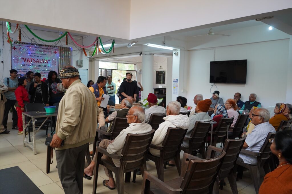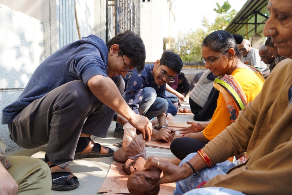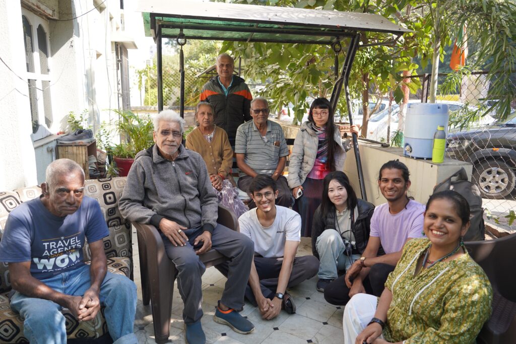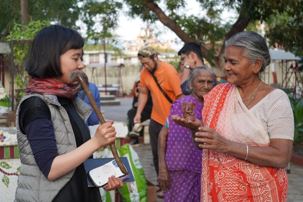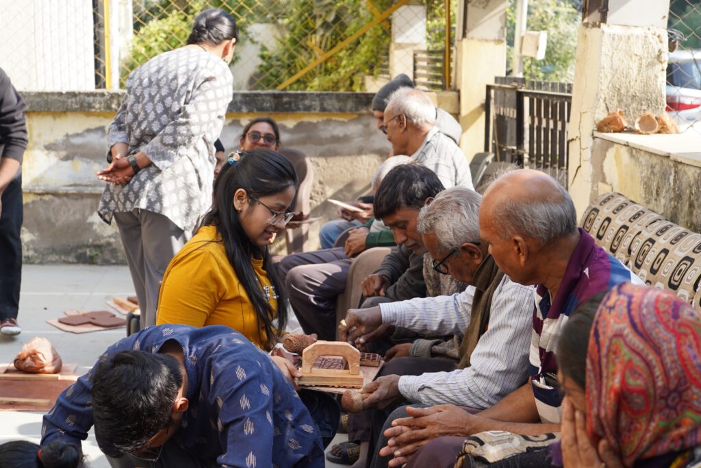 訪問先はアーメダバード市内の三つの高齢者施設で、短期滞在型から長期居住型まで、運営形態や背景がそれぞれ異なっていました。特に、インド赤十字社が運営するVatsalya Senior Citizens Homeでは、独立して生活する高齢者の方々が活発に創造的活動に参加し、学生たちとの交流の中で共創的な関係が生まれました。また、Shree Maniben Tribhuvan Matragruhでは、高齢者から道具の改良に関する具体的な助言を受け、学生たちは実践を通じて「道具づくり」の本質を学びました。こうした出会いは、単なる制作体験を超えた、互いの理解と学びの場となりました。