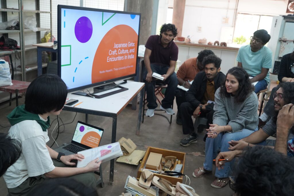 授業内では日本の伝統的な履き物である「下駄」の制作技法をメインの制作とし、その制作過程で出てくる木の端材を土でプロセスを記録を各自記録しました。参加学生たちの専門は建築や、ユニバーサルデザインやリテールデザイン、アニメーションなど多岐に渡りそれぞれの個性が木と土を行き来しながら浮き彫りとなりました。また本学より派遣した学生の江口暁香さんには「漆」について、金子葵さんには「藍」についてそれぞれ日本特有の技法や素材についても発表を行い現地の学生と活発な意見交換ができました。さらには国際共修Bも現地と日本を繋ぎ実施し、NIDと本学の学生が主体となった授業を実施しました。
